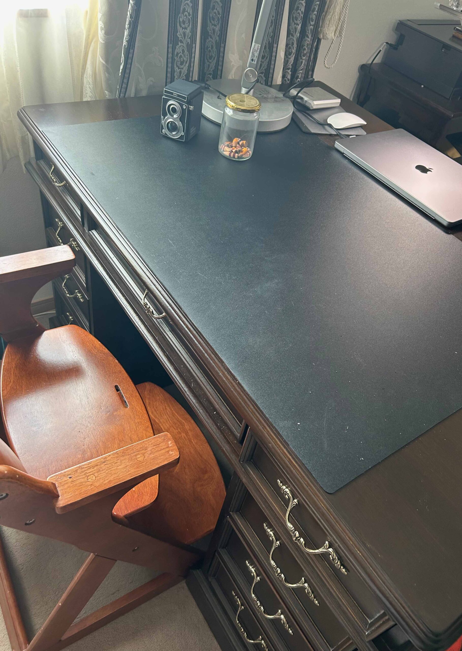 アンティークデスクなどで革が貼ってあるものなどありますが、柔らかさがあるので、ボールペンなどにはちょうどいいのですが、息子のように鉛筆で書く場合は下敷きが必要になります。
